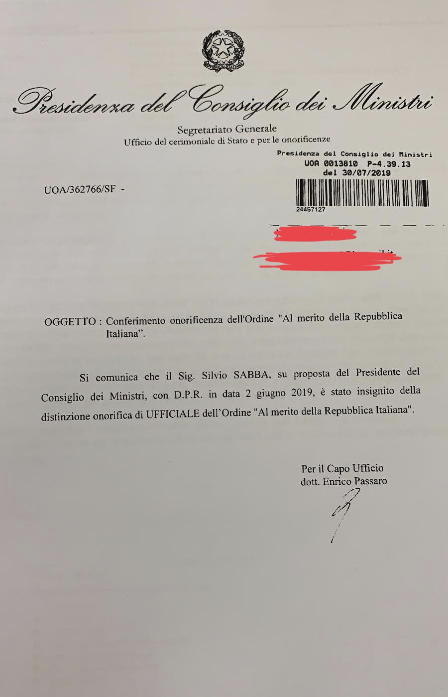 39 lettera al presidente del consiglio dei ministri