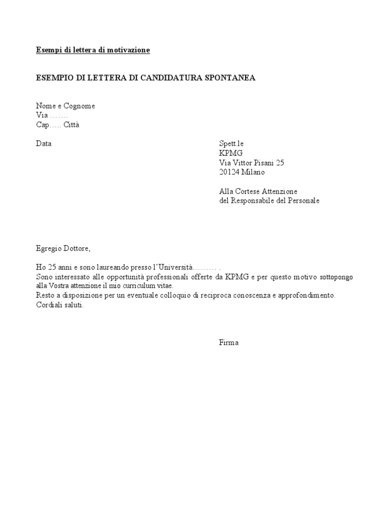 Esempi di lettera motivazionale per candidarsi - FrasiX Qui di seguito inseriamo un esempio di lettera motivazionale a cui potete ispirarvi per scrivere la vostra. Gent.ma (mo) (nome e cognome del responsabile della selezione o delle risorse umane), ho deciso di presentare la mia candidatura presso la vostra azienda, in quanto ne condivido etica e filosofia. Come voi anche io sono convinto che l ...